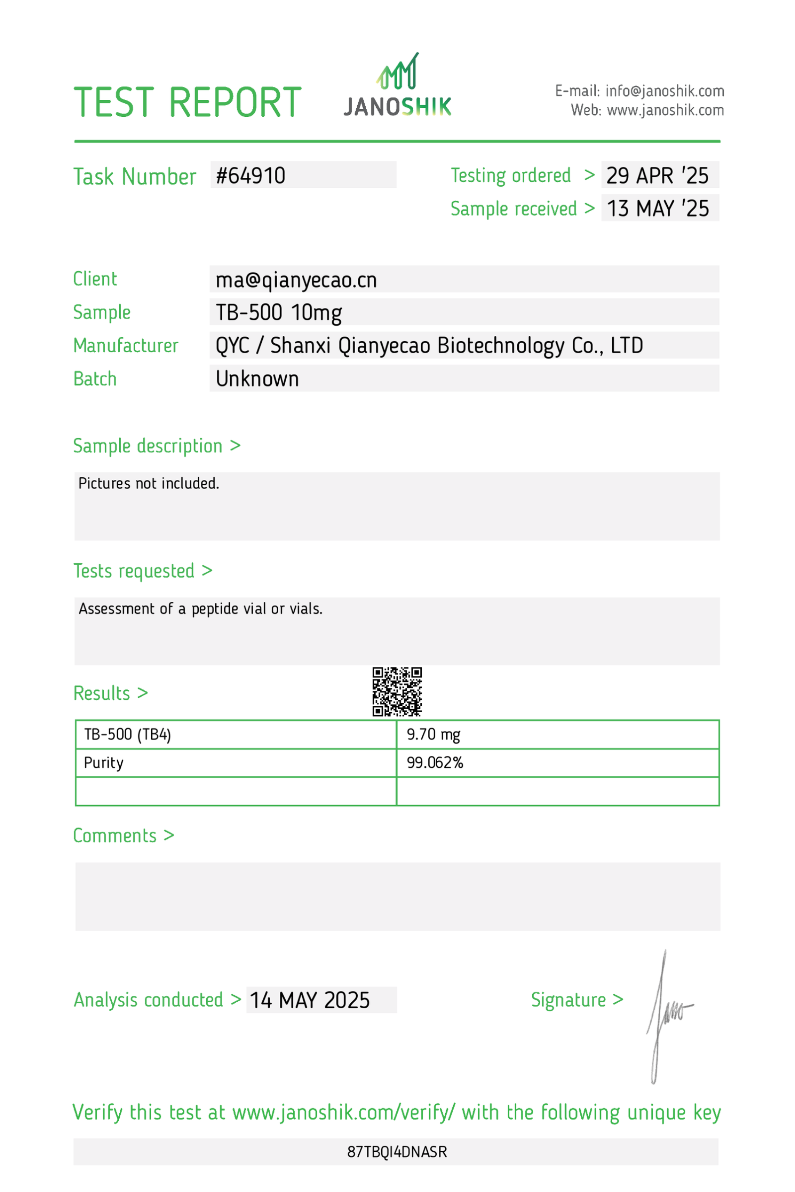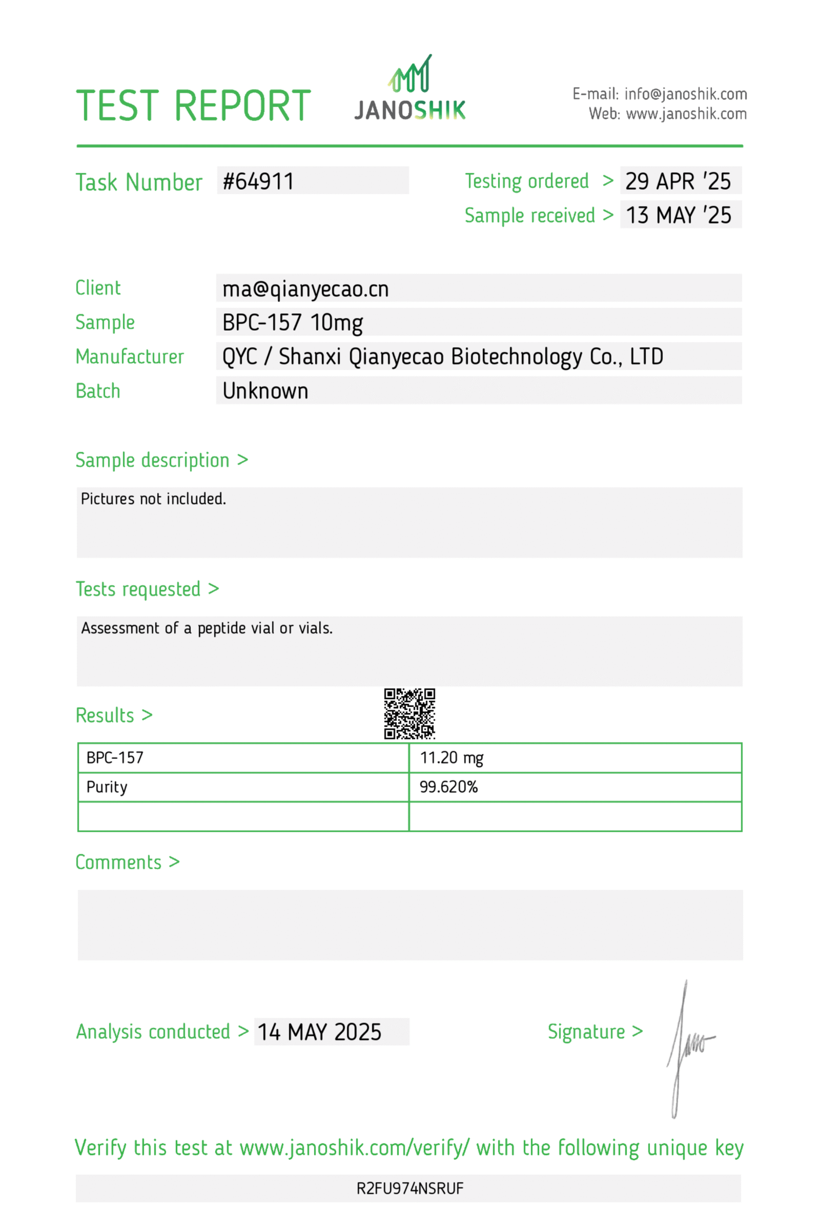 • Third-party verification link provided per lot (Janoshik)